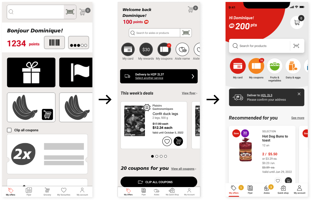 - Je prenais régulièrement un pas de recul sur l’avancement du design. Par exemple, je me suis assuré que chaque bloc pouvait s’adapter aux différents programmes de loyauté offerts par les bannières du groupe Metro, ou que chaque série de filtres d’adaptait à chaque allée de l’épicerie en ligne.