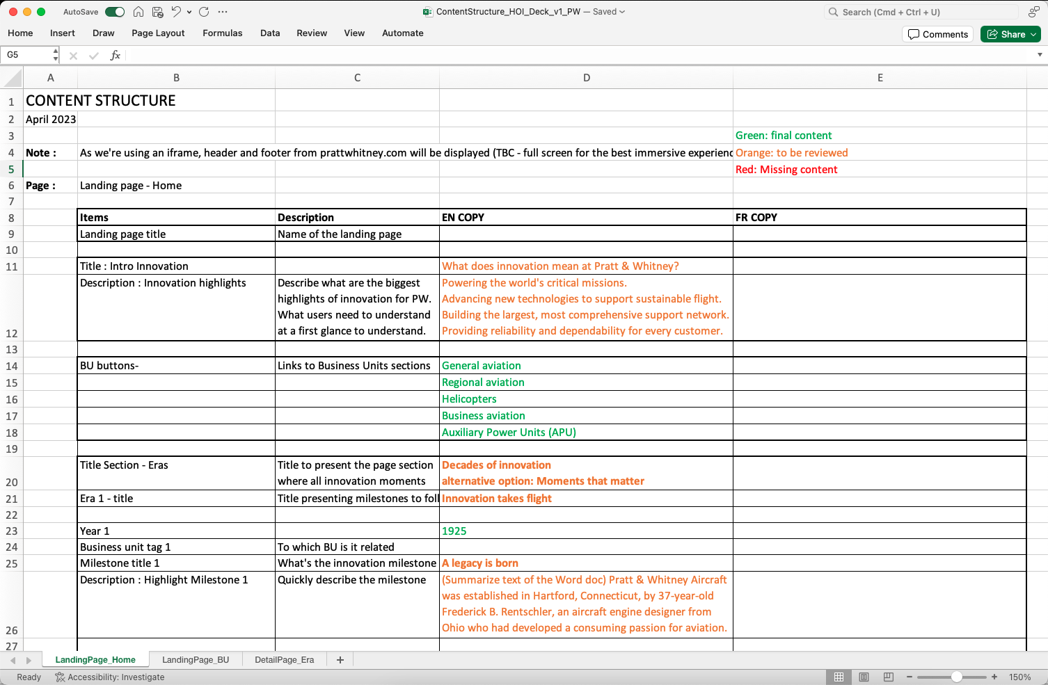 Maintenant que nous avions notre structure, nous pouvions nous attaquer aux textes. L’équipe contenu et moi sommes partis des wireframes pour recréer les gabarits structurés dans un nouveau document Excel : nous avons segmenté les textes existants qui décrivaient les avancées technologiques, puis nous avons identifié les textes à retravailler et ceux qui manquaient (en décrivant l’intention derrière les textes à créer).