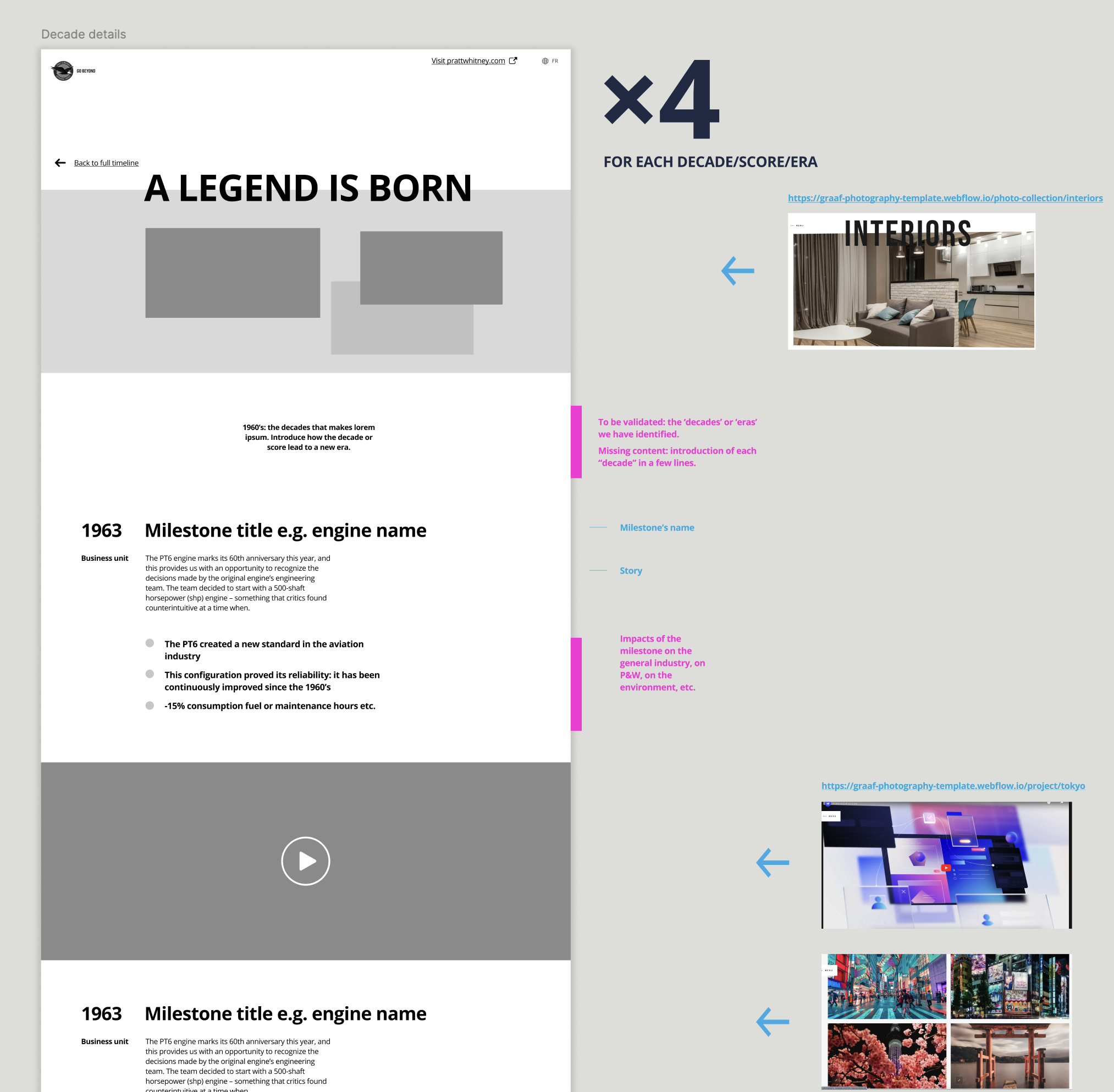 J’ai ensuite reproduit en wireframes les modules retenus, que j’ai arrangés de manière à raconter une histoire cohérente, chaque décennie représentant un pas dans l’histoire de l’aviation (merci Figma pour les auto-layouts).